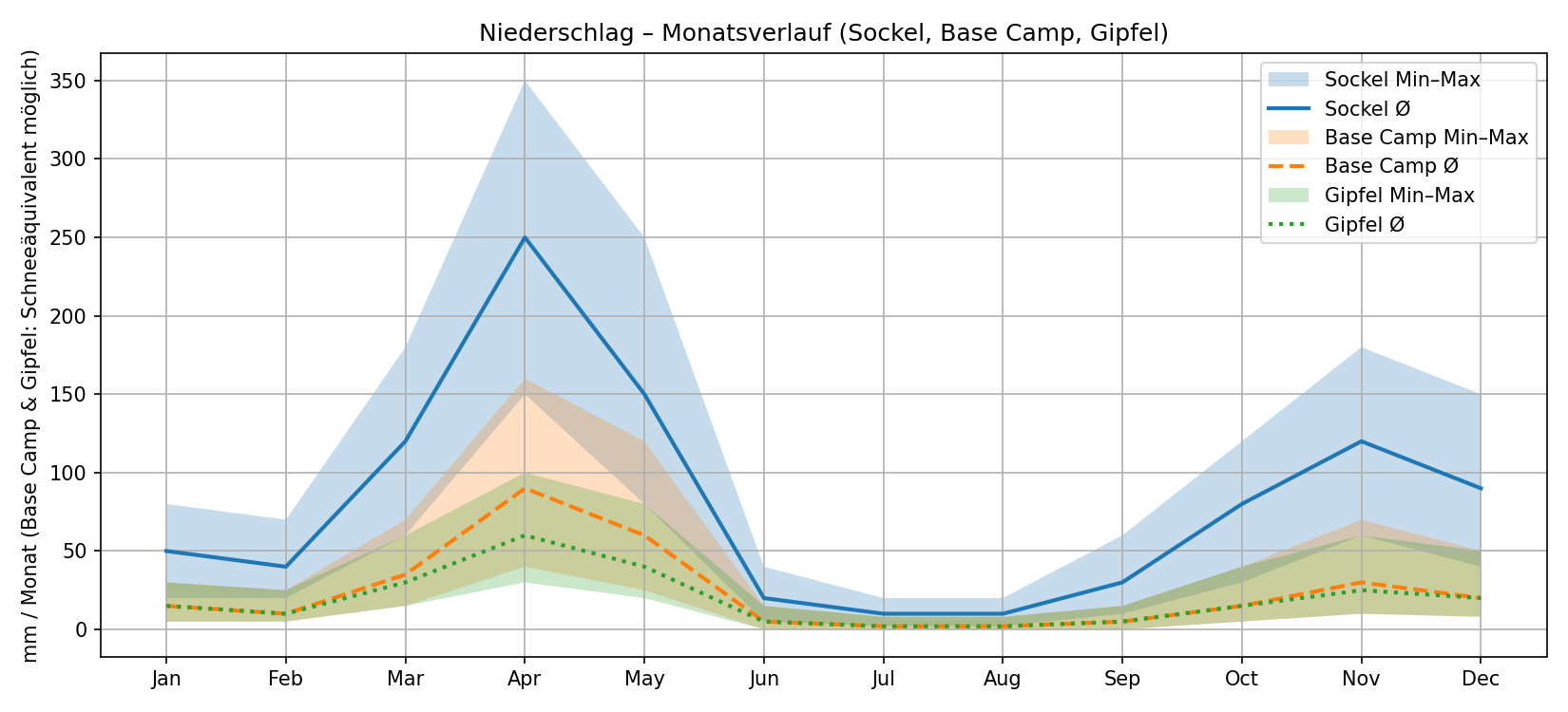 Am Gipfel hingegen heißt Niederschlag häufig Schnee, Eis, Vereisung und schlechte Sicht – selbst wenn die absoluten Mengen geringer erscheinen.