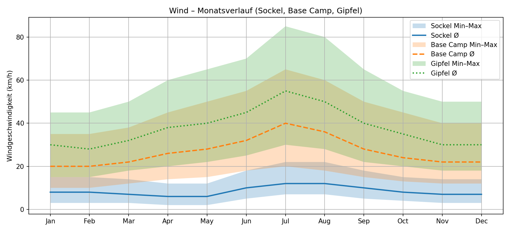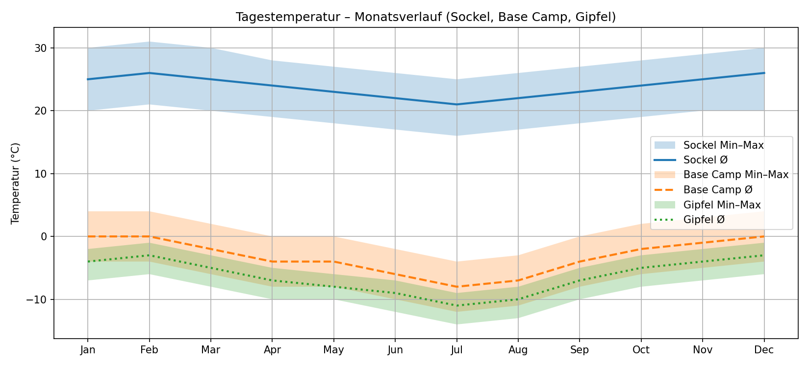 Selbst in den „warmen“ Monaten bewegen sich die Durchschnittswerte tagsüber unter dem Gefrierpunkt, nachts deutlich darunter. In den Wintermonaten Juli und August erreichen Minima, bei denen Ausrüstung nicht mehr optional, sondern überlebensrelevant wird.